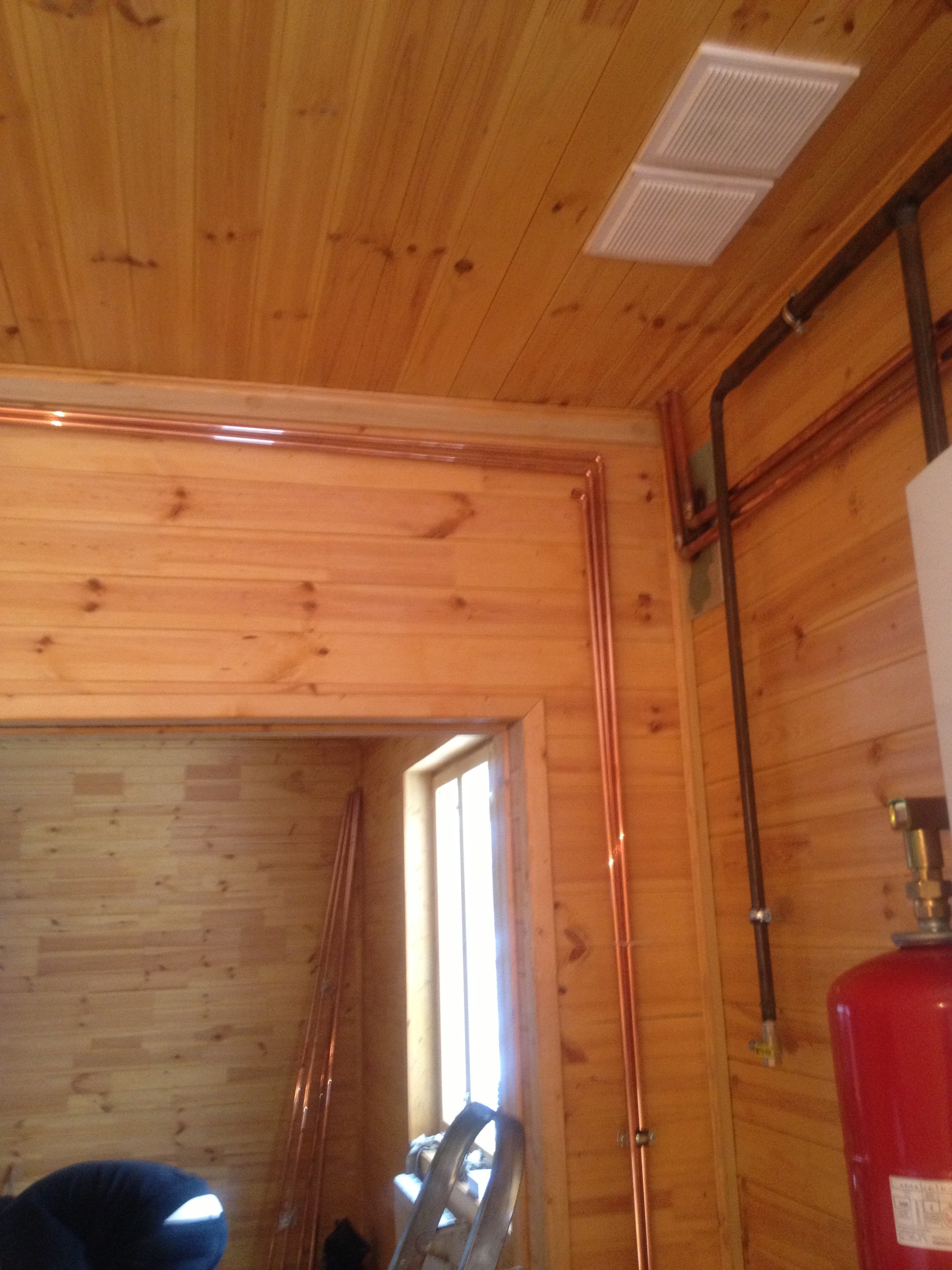 - Чтобы система отопления в деревянном доме была долговечной, трубы лучше устанавливать медные. Они надежные, не боятся перепада температур и исключают вероятность прорыва, например, в местах стыков, как это часто случается с пластиковыми. Это очень важно, так как если прорвут трубы с водой, дерево очень сильно пострадает, и сумма на восстановительные работы будет намного выше, чем стоит установка меди.